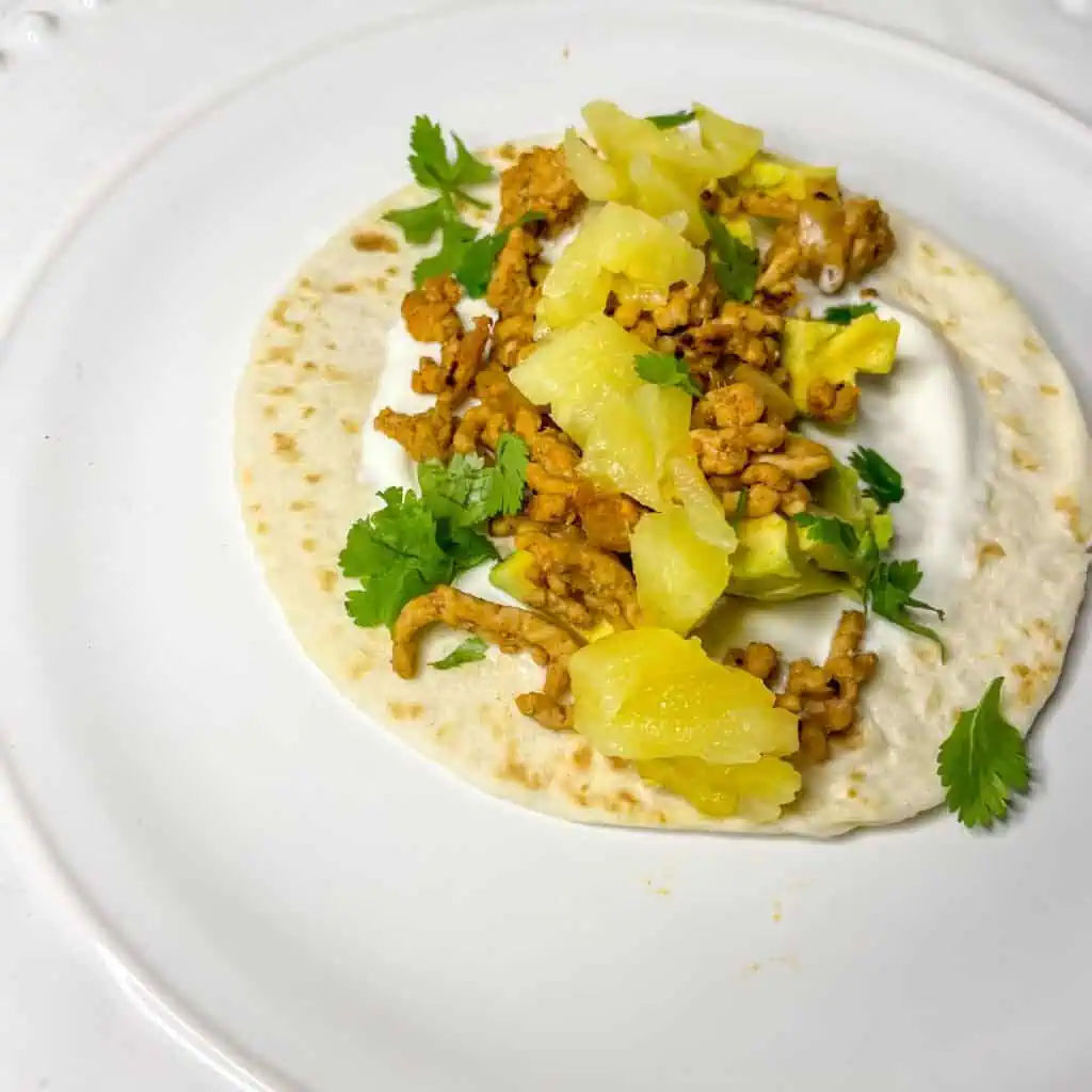 - Taco wraps, soured cream, avocado, tinned pineapple– these are your toppings. You can, of course, use fresh pineapple but tinned pineapple makes this really quick and easy.