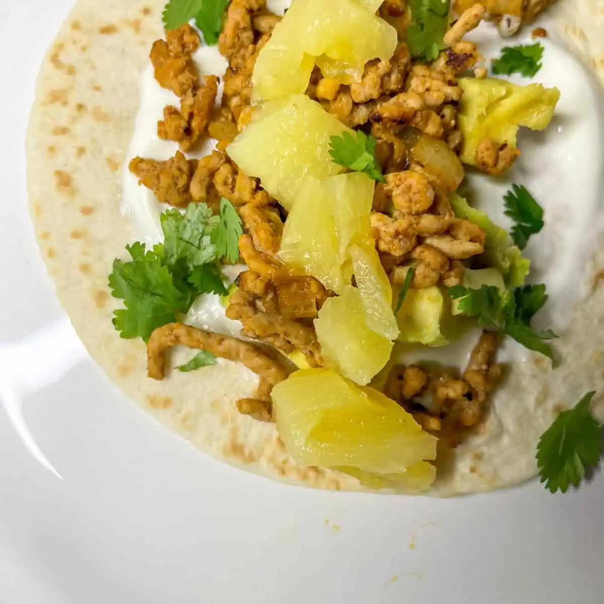 - Spread a teaspoon of soured cream over each wrap. Top with avocado, then pork, then pineapple. Sprinkle each one with a pinch of fresh coriander. Enjoy!