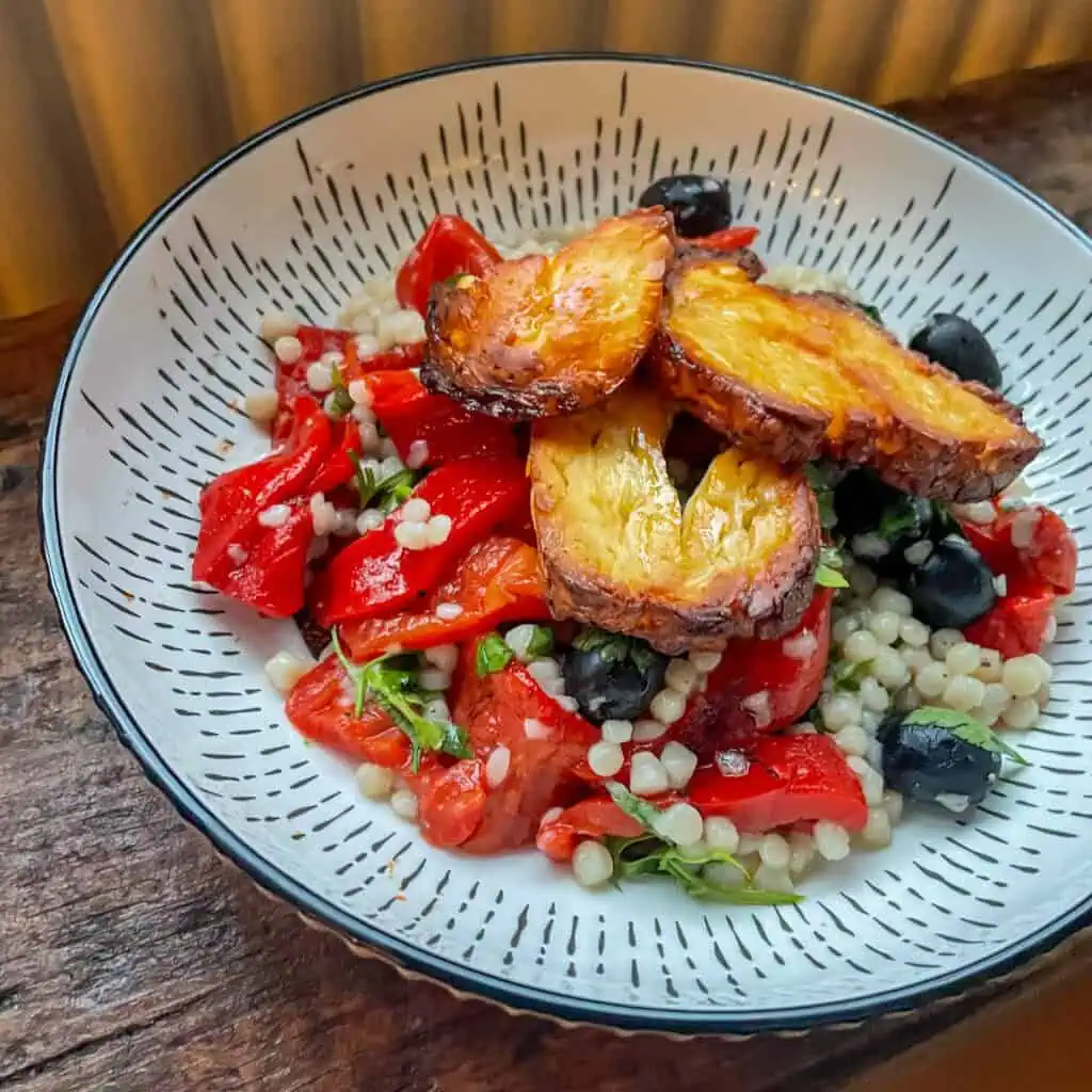 - To serve, spoon the couscous mixture into bowls and top with the baked halloumi.