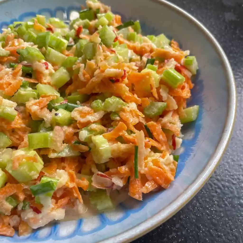 - Carrot, celery and apple โ these are your slaw vegetables. You could also add some red or white cabbage (finely chopped) and some red onion.