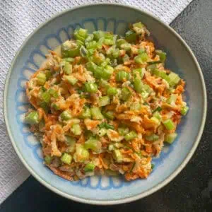 - Grate the carrot and apples. Finely chop the celery. Add to a large bowl.