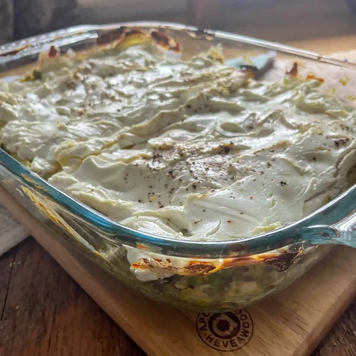 - In a large oven proof dish, layer lasagne, asparagus mix, lasagne, asparagus mix, lasagne. Spread the goats’ cheese over the top layer of lasagne.