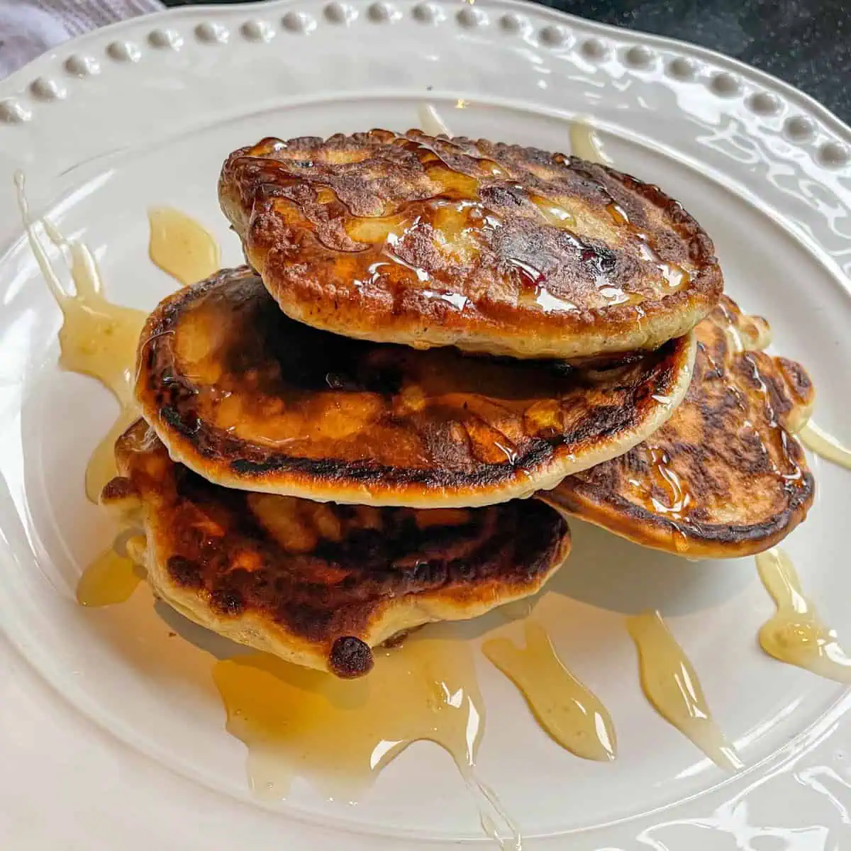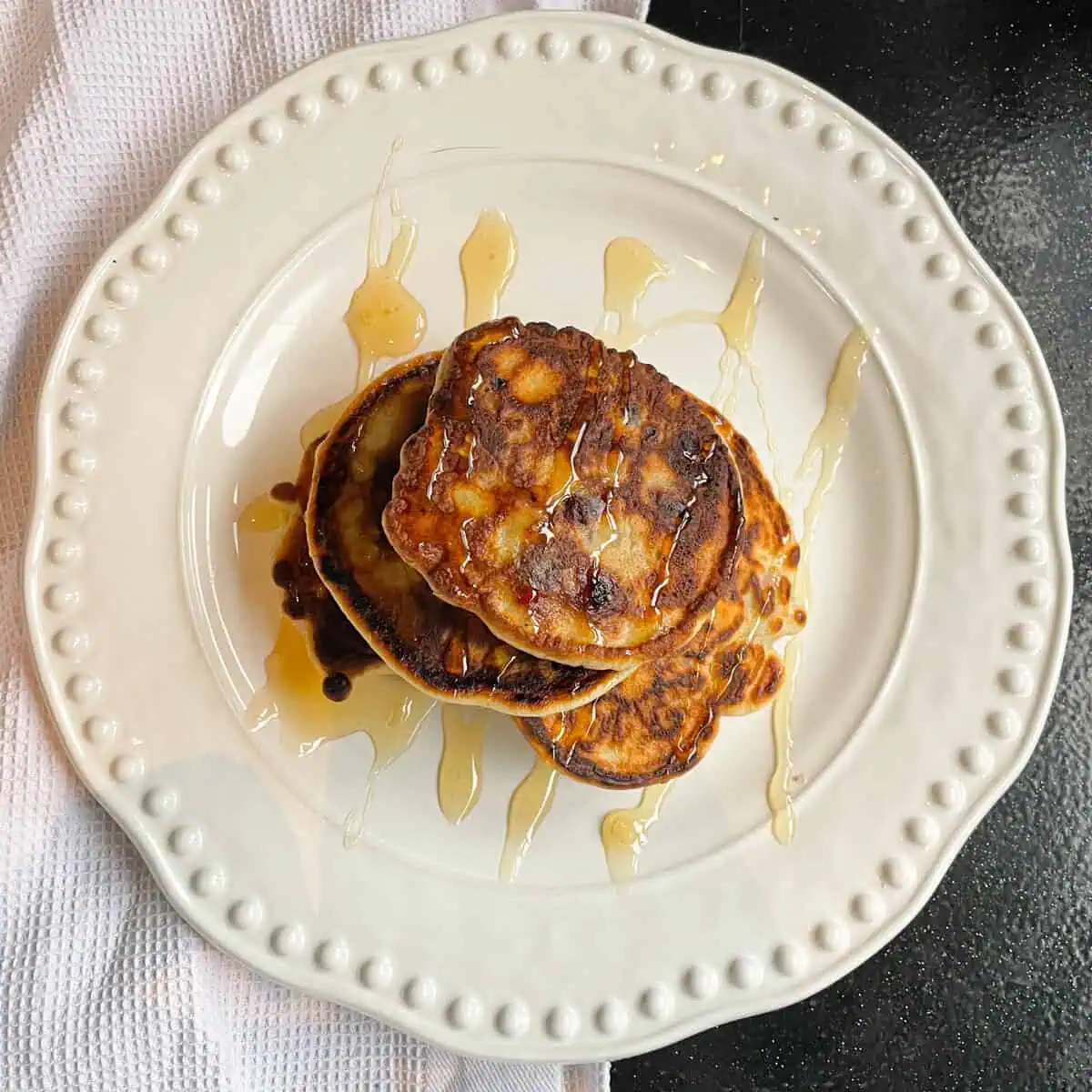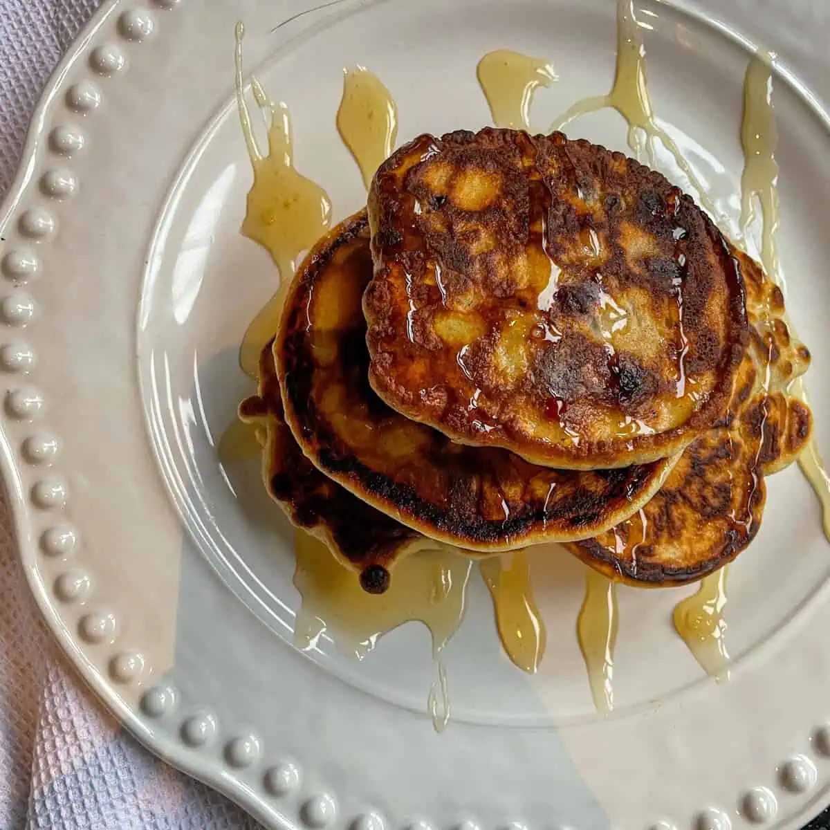 You can top with whatever you like. I like honey, because the pancakes themselves are unsweetened, but yoghurt, a handful of berries, even some ice cream work beautifully too.