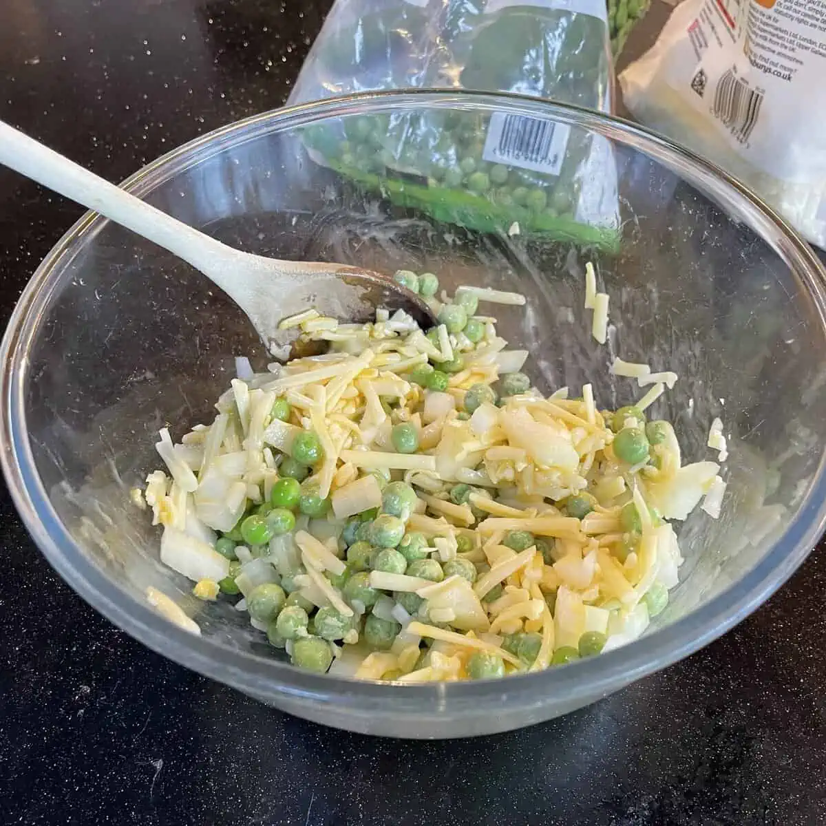 - Crack one of the eggs into a bowl. Add the cheddar, onion and peas and stir until everything is coated in the egg.