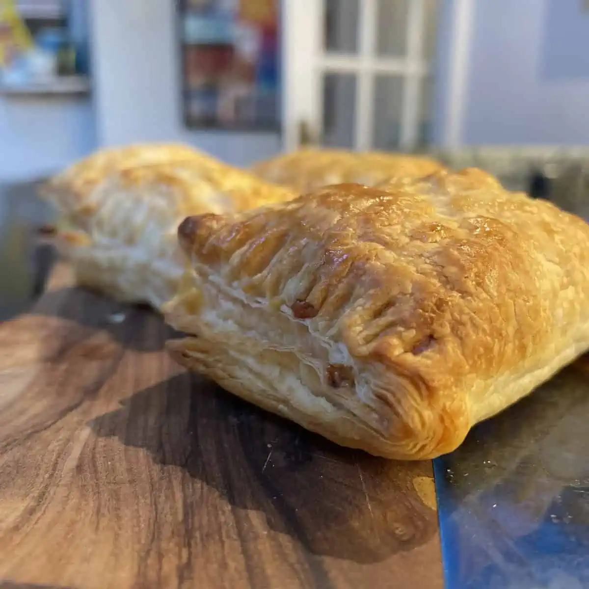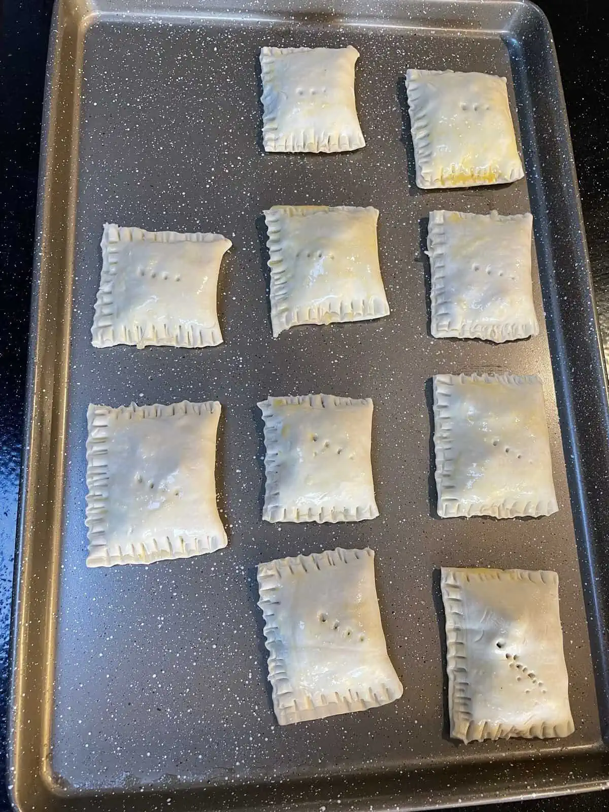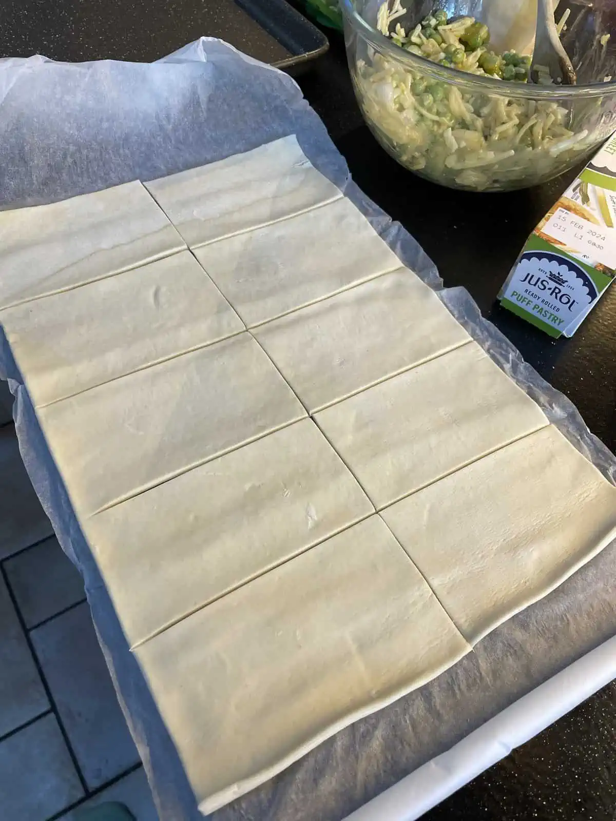 - Unroll the puff pastry sheet. Cut in half longways, then into 5 pieces along the short edge so that you have 10 equal sized rectangles.