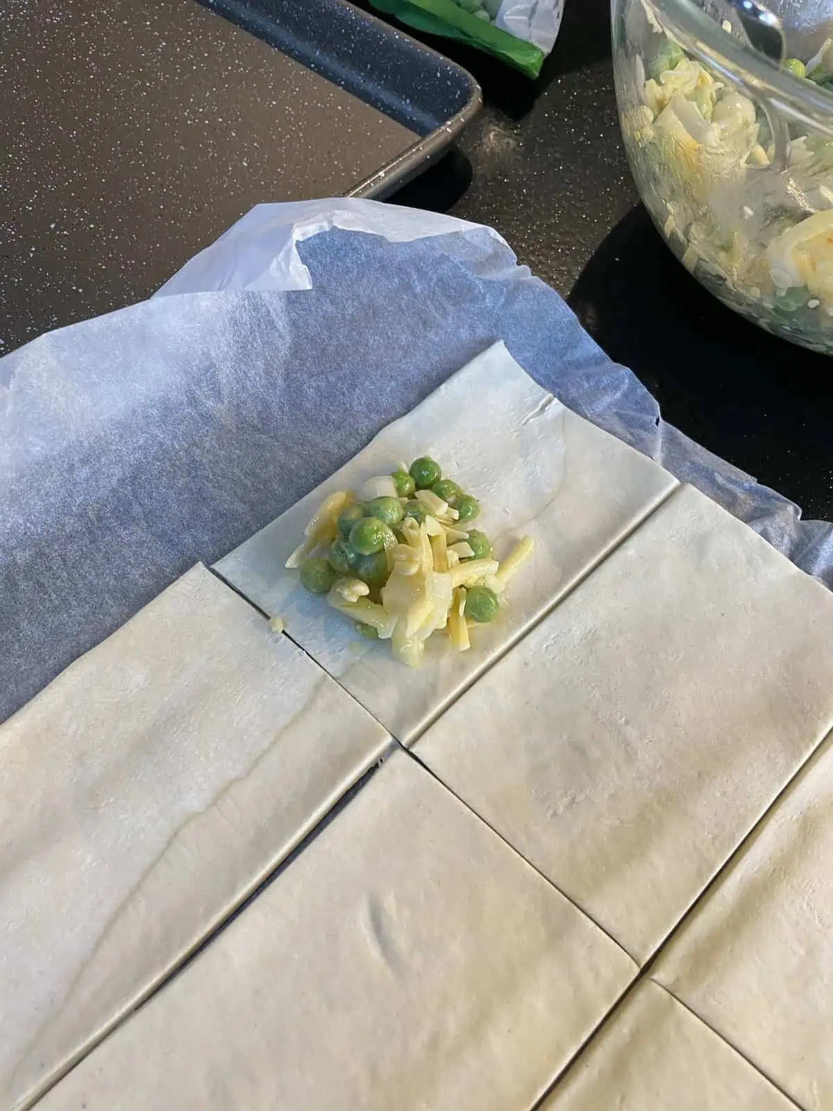 Cheddar, Onion and Pea Puff Pastry Rolls