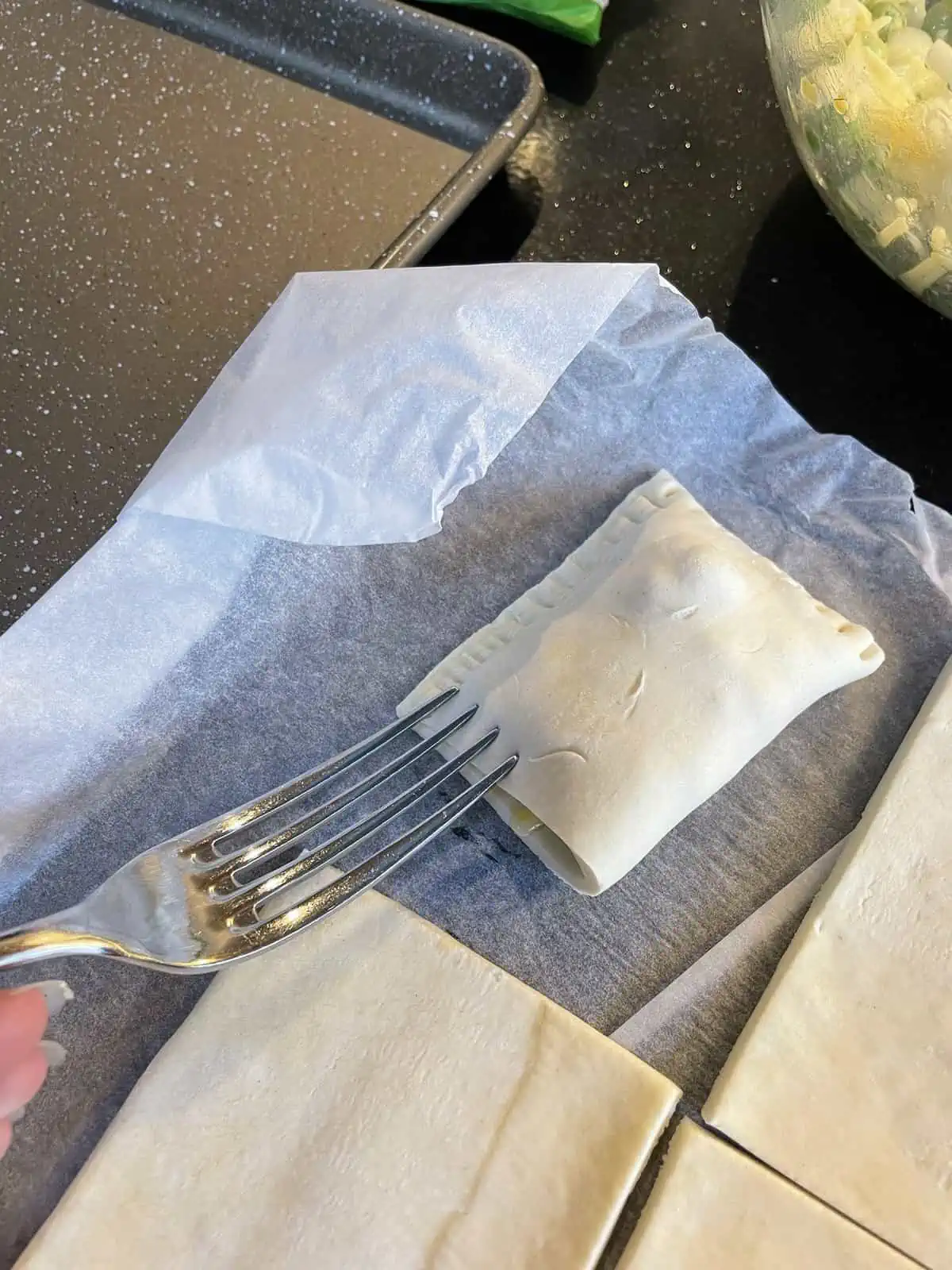 - Place a spoonful of the filling on one half of each piece of pastry. Fold the other half over and press down all around with your thumb or the back of a fork to seal.