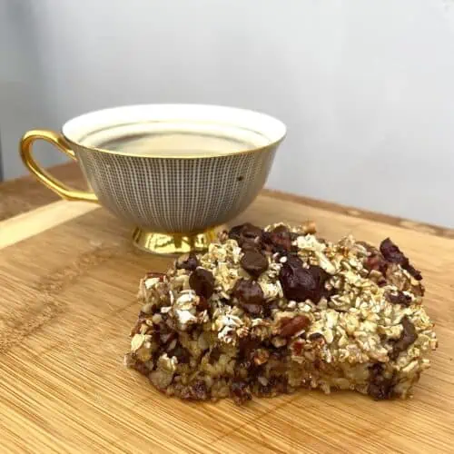 If you whizz the oats up to a powder, you’ll end up with a lighter, cakier version. My version is more like a traditional oat bar.