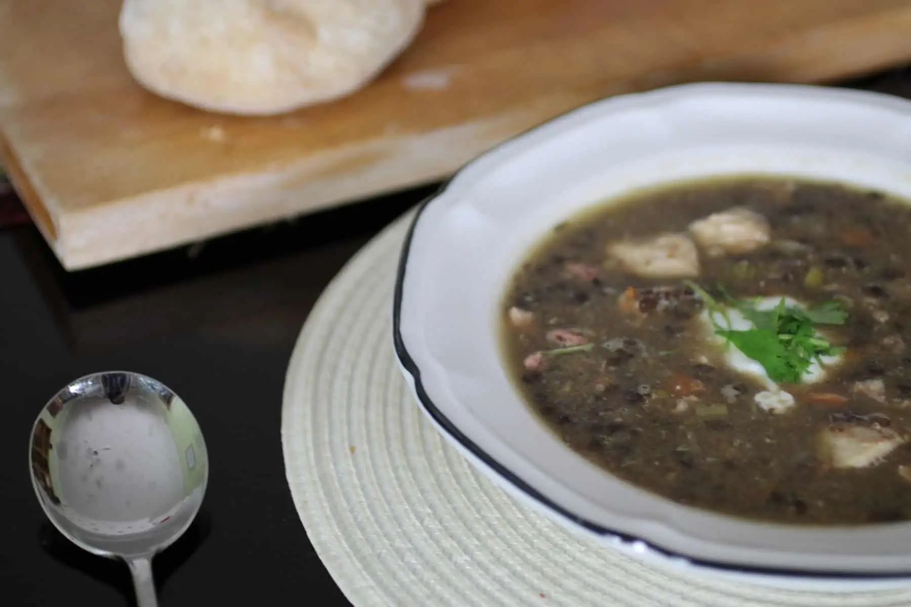 4. Blend about half of the soup with a hand blender – you still want the soup to be fairly chunky, but blending some of the lentils will thicken it.