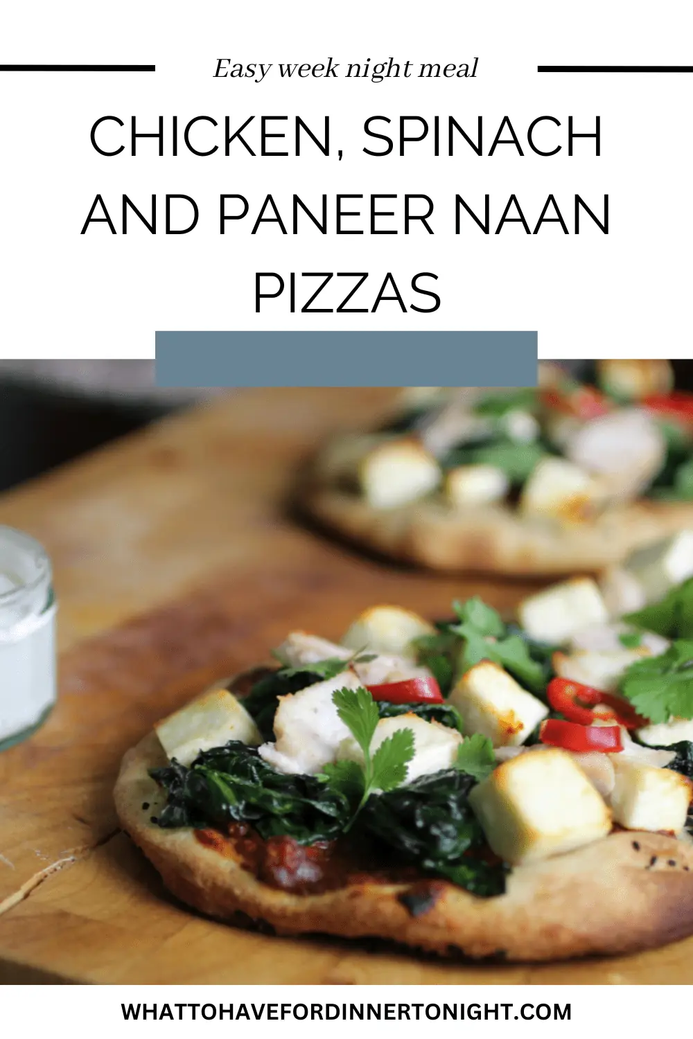 - Spread the tomato sauce over the top of each naan bread. Squeeze the spinach to remove any excess water, then dot it over the naans. Sprinkle over the chicken. Chop the paneer and add this too.
