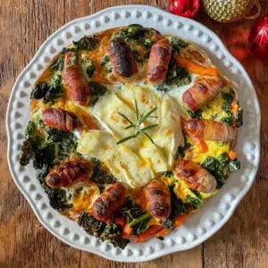 The frittata is topped with pigs in blankets and brie – a classic festive combination! Again, you can use leftover pigs in blankets from your Christmas dinner, but try to make sure that you don’t use ones that are already quite well cooked – they could burn under the grill.