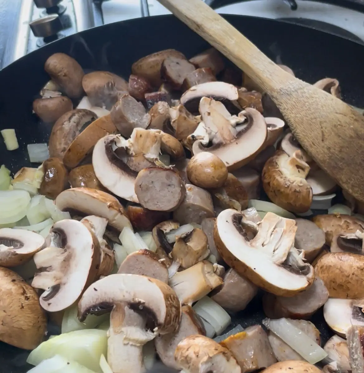 - Thickly slice the cooked sausages. Slice the mushrooms. Add the mushrooms and sausages to the pan with the onion and garlic. Cook for another 7-8 minutes.