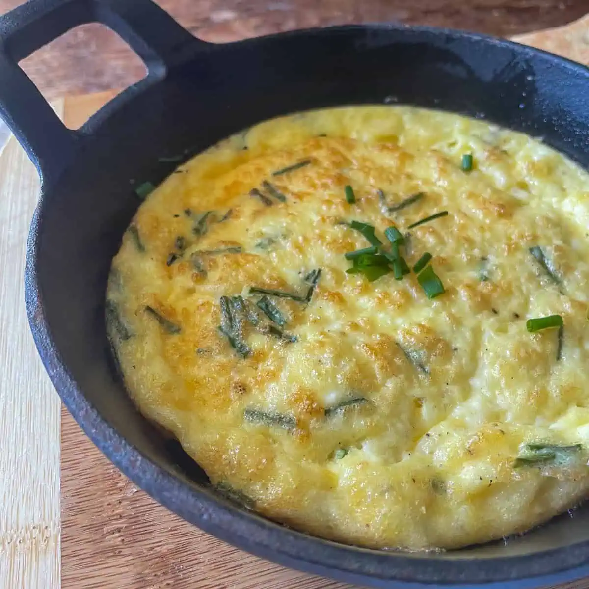 - Pour the egg mix into the ovenproof dish. Place in the middle of the oven and cook for 10 minutes until risen, fluffy and golden.