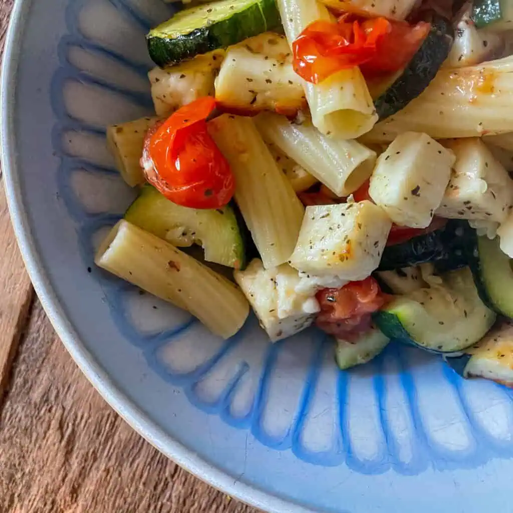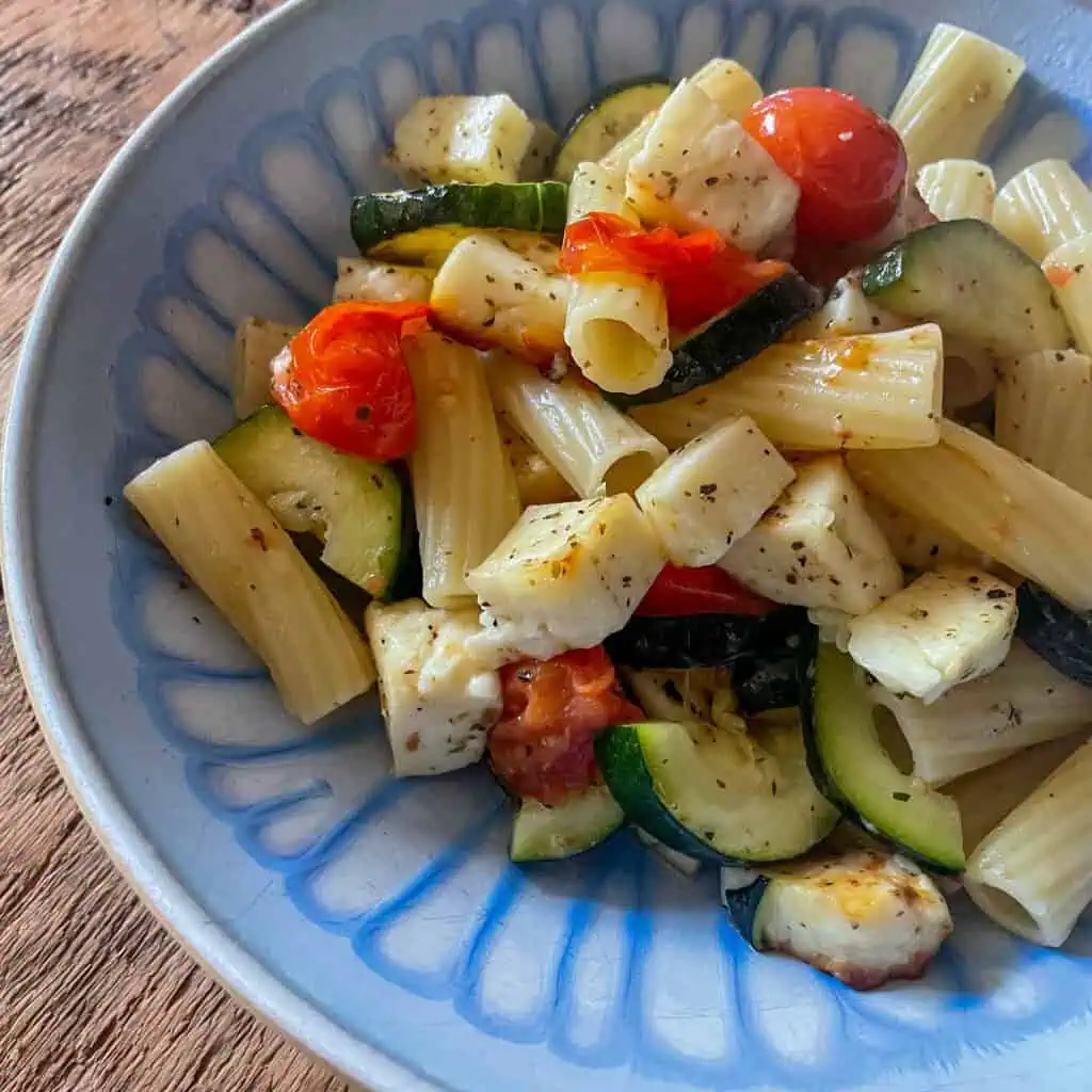 The โsauceโ of halloumi, courgettes and tomatoes is roasted in the oven, then the veg, cheese and any juices from the pan are mixed in with the pasta and a little of the pasta water. Voila! This cheese pasta with vegetables will be your new favourite.