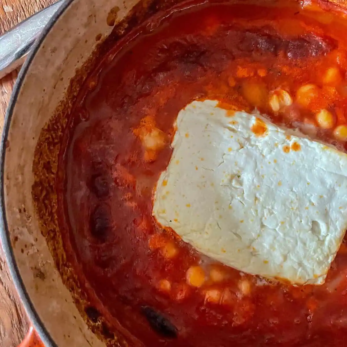 - Add the drained chickpeas and top with the block of feta. Put in the oven for 25-30 minutes, until the feta is soft and golden at the edges.