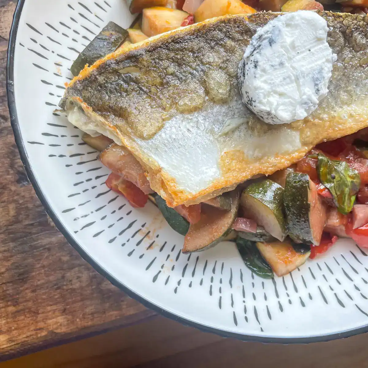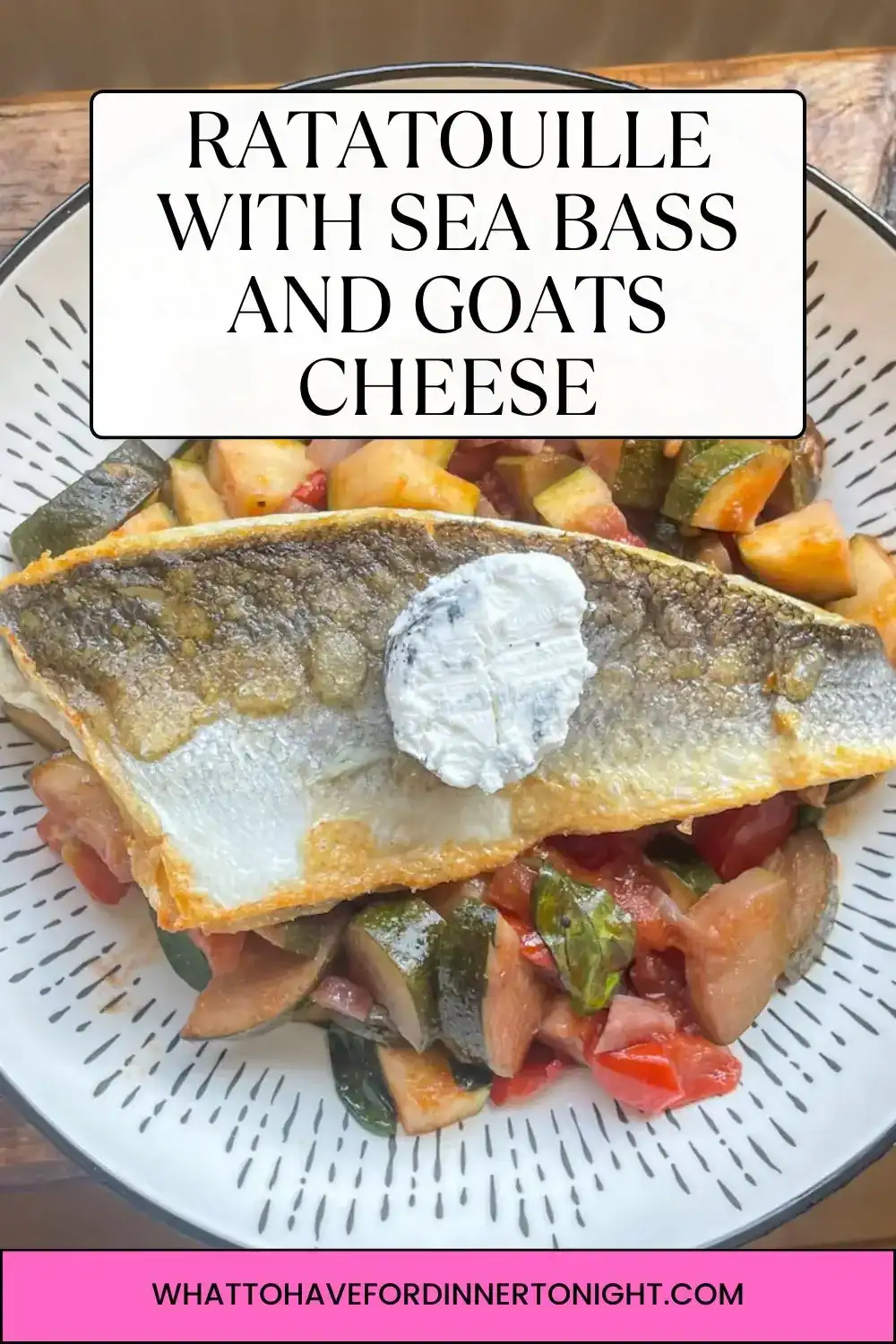 Bright, tasty ratatouille with delicious crispy sea bass and creamy goats cheese – yum!