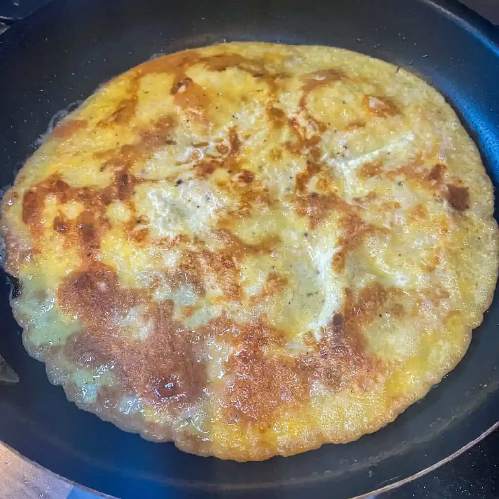 - Allow to cook for 2-3 minutes. Lift the edge of the omelette with a spatula. If it looks like the image above at this time, flip it over. If not, give it a few more minutes.