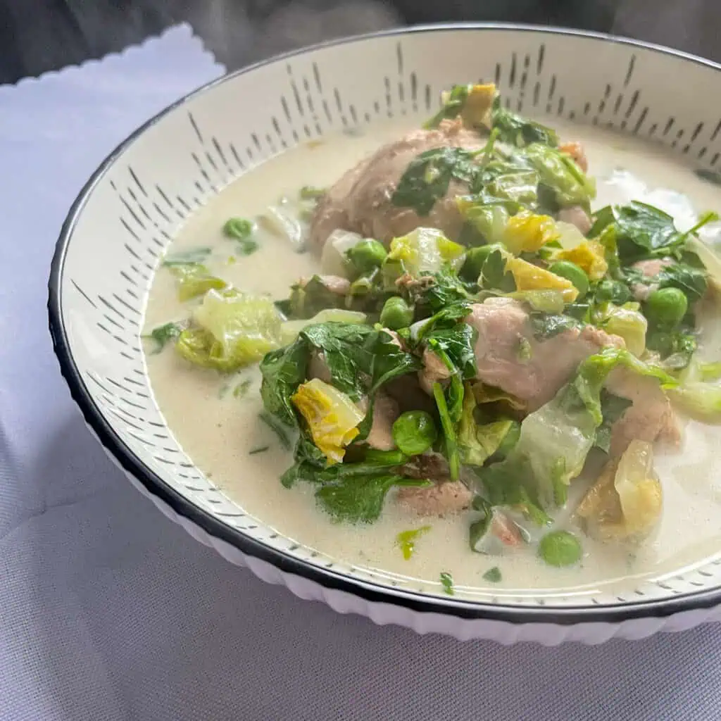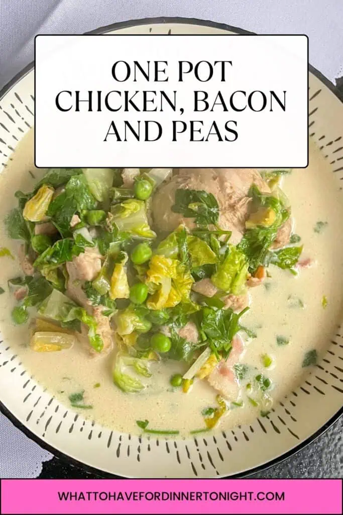 This creamy one pot chicken, bacon and peas is perfect with a doorstep of bread to mop up all those juices.