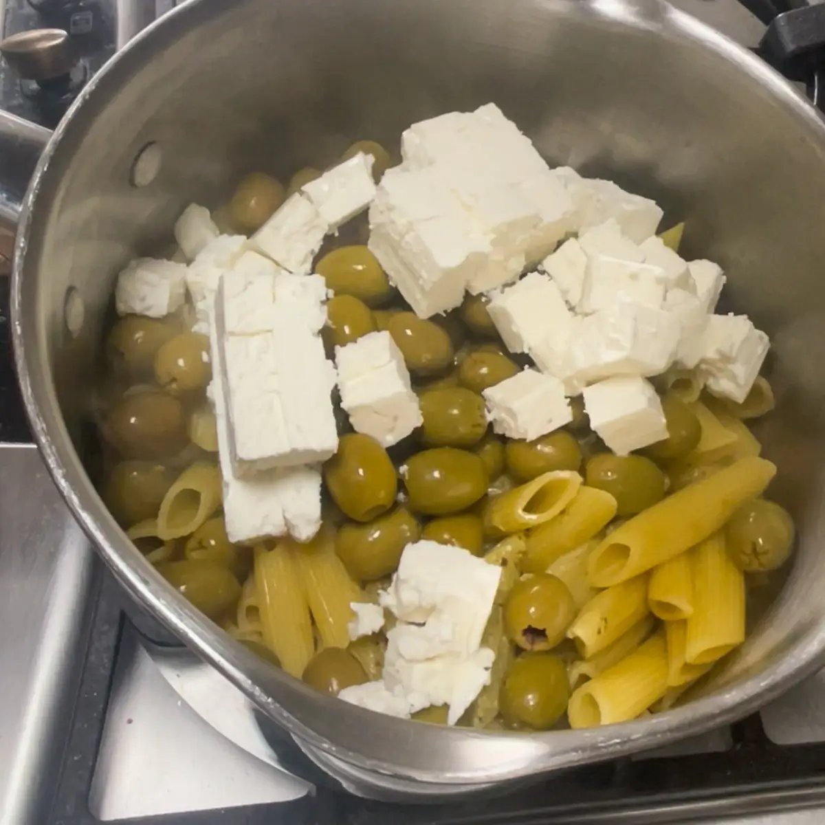 - 3. Add your drained green olives and chopped feta.
