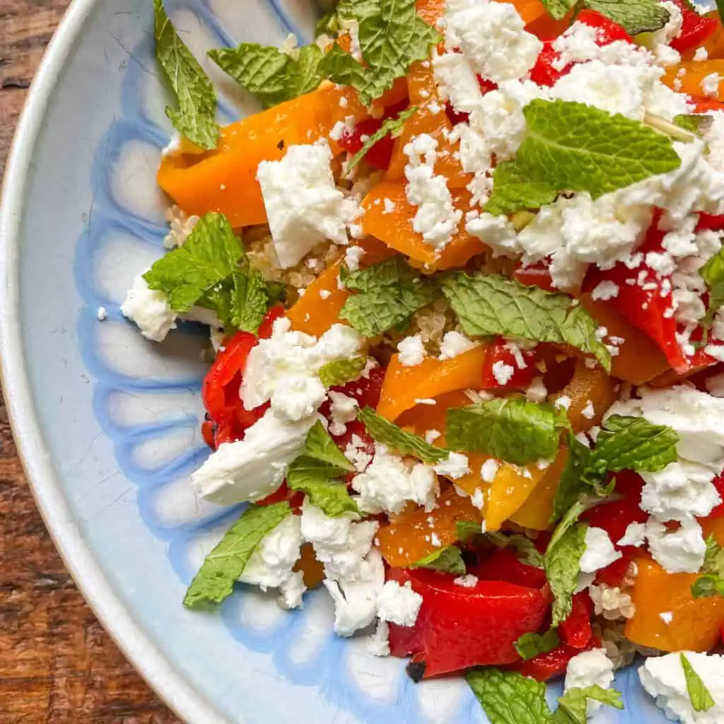 - Slice the roasted peppers and put on top of the quinoa. Crumble over the feta, then sprinkle over the mint and serve.