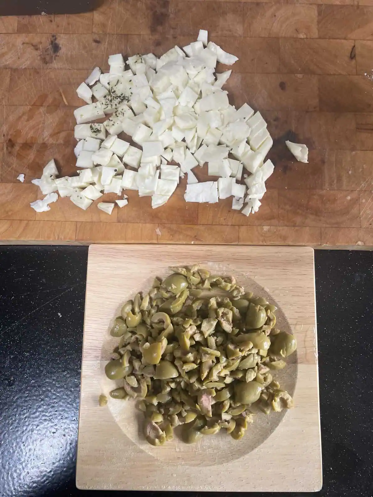 - Chop the halloumi and green olives into small chunks, about 0.5cm or smaller.