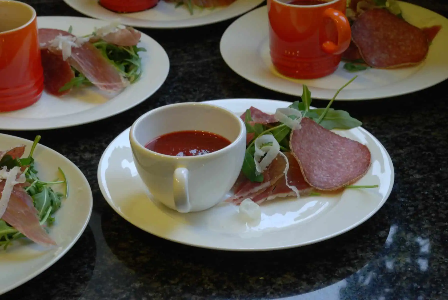 Our starter was Hugh F-W’s bloody tomato soup (with beetroot) together with Spanish ham, rocket, parmesan and balsamic vinegar (shot of vodka in the soup optional) …….all twelve wolfed this down.
