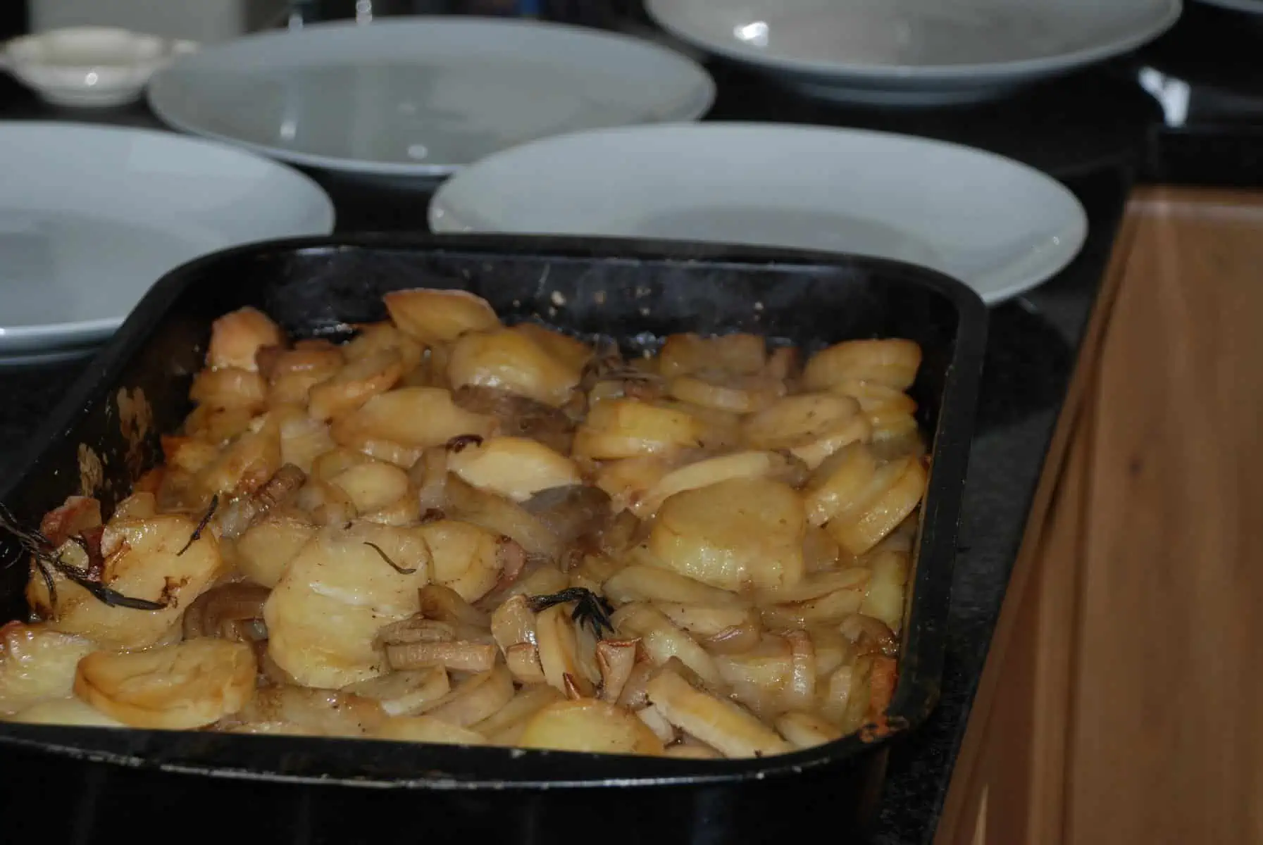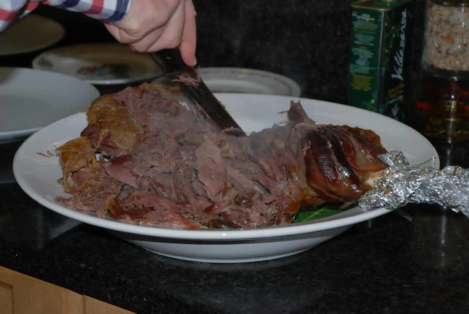 “We decided to invite all our family round for a Saturday lunch on the 14th of March. After mulling the recipe books we plumped for mutton and there were no regrets at all. One hour at Hartshorn’s butchers in Oswestry (that story’s for another day) resulted in a 10.5lb leg – we put the oven on at 08:30 and blasted it at 200 degrees (centigrade) for 30 mins and then dropped the temperature to 140 degrees. Potatoes, onion and garlic were placed under the meat at the time the temperature was dropped and it was cooked in the oven at this low temperature for 7 hours.