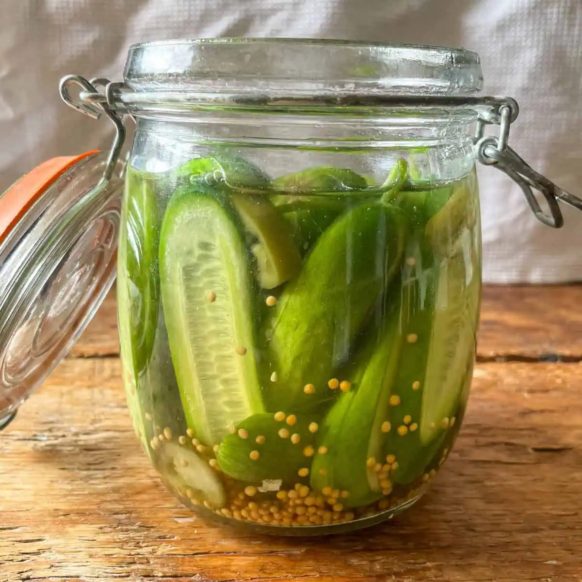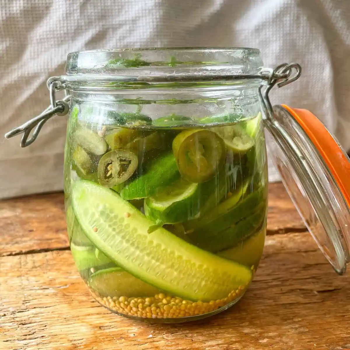 - Put the cucumbers and jalapeños in the pickling jar. Pour over the liquid (including all of the seeds). Close the jar. Transfer to the fridge and leave for at least 12 hours before eating for best results.