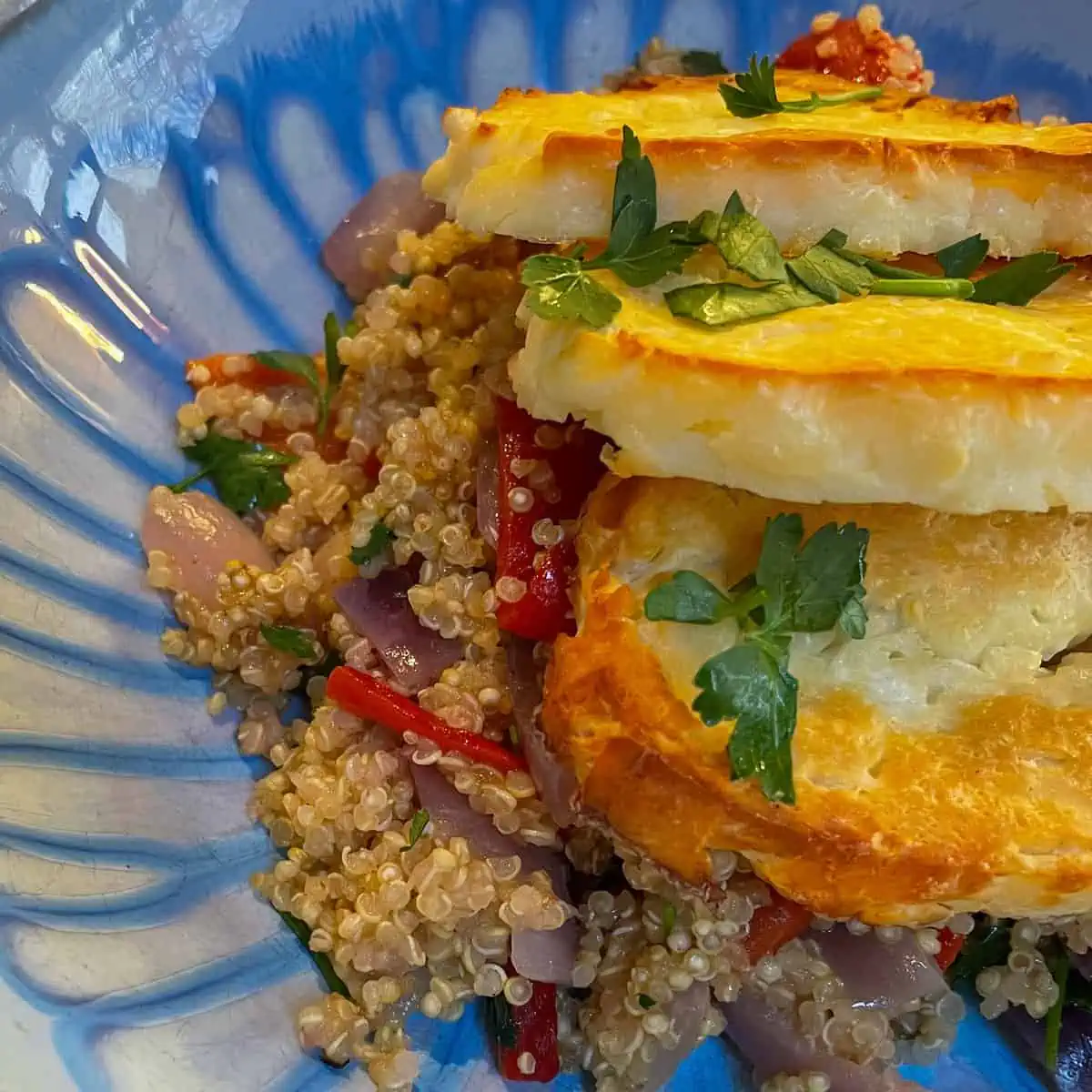 - When the quinoa is cooked, add the zest and the juice of the lemon and the chopped parsley. Serve the quinoa topped with slices of the halloumi.